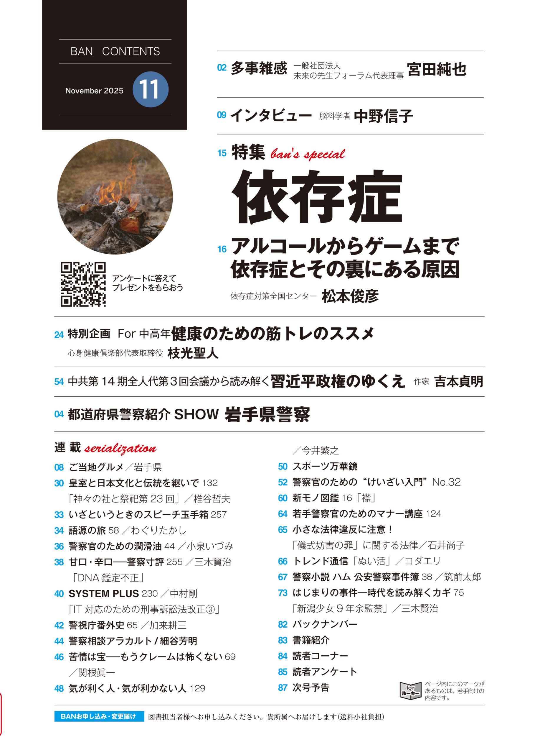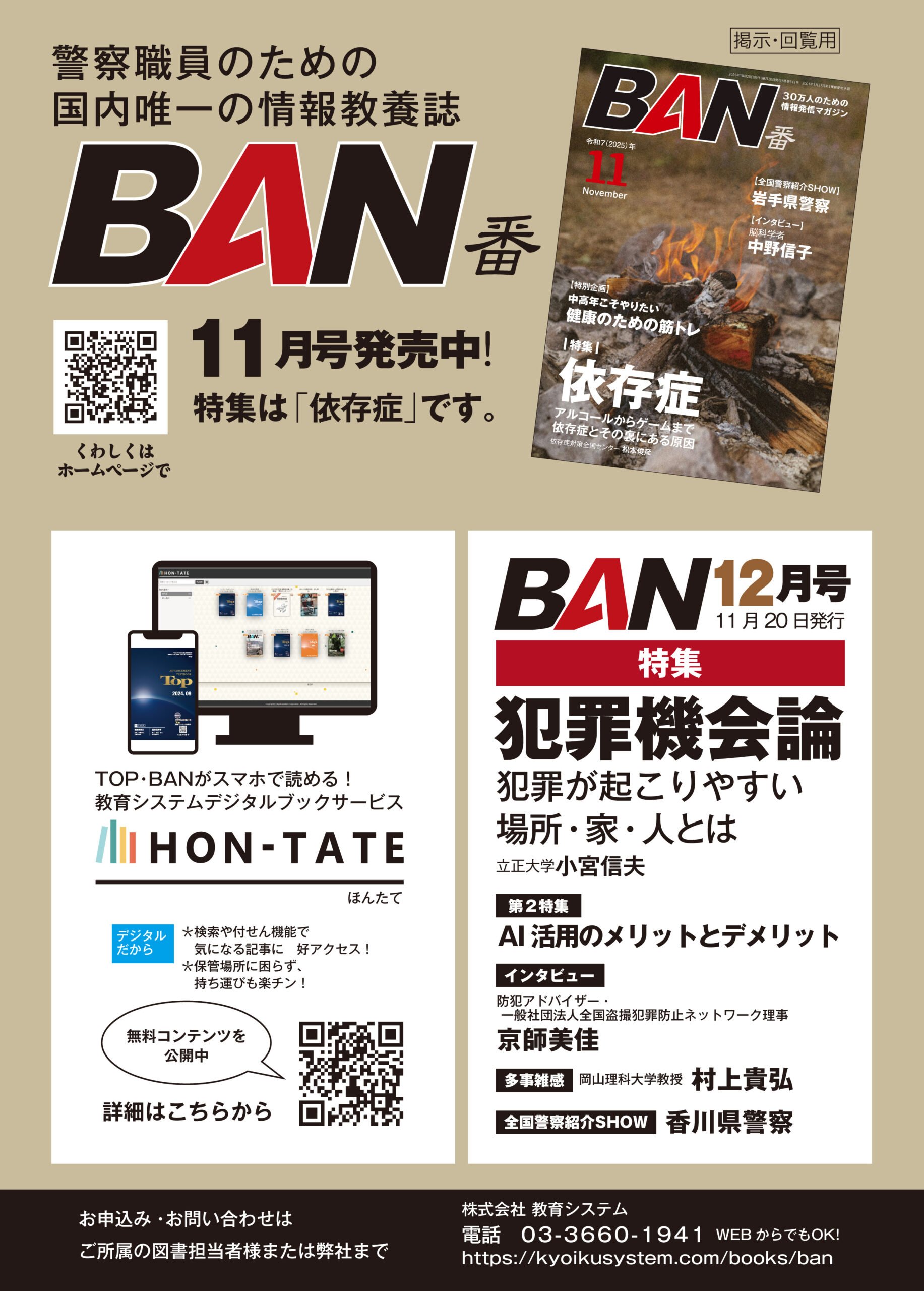 BANは、警察官でなければわからない共感できる情報や声など、警察官のために企画、取材制作している、日本で唯一の警察職員のための『情報教養誌』です。
