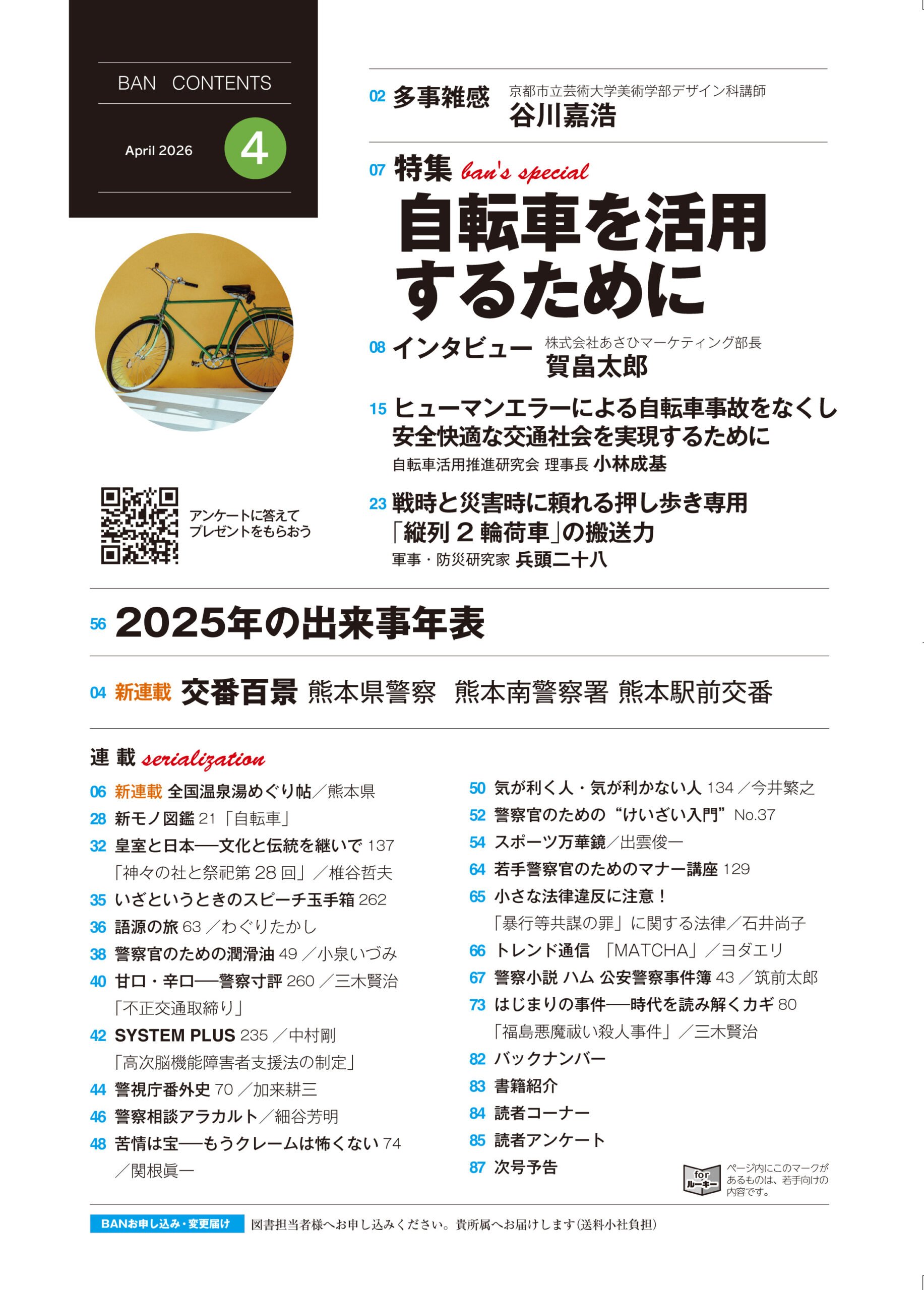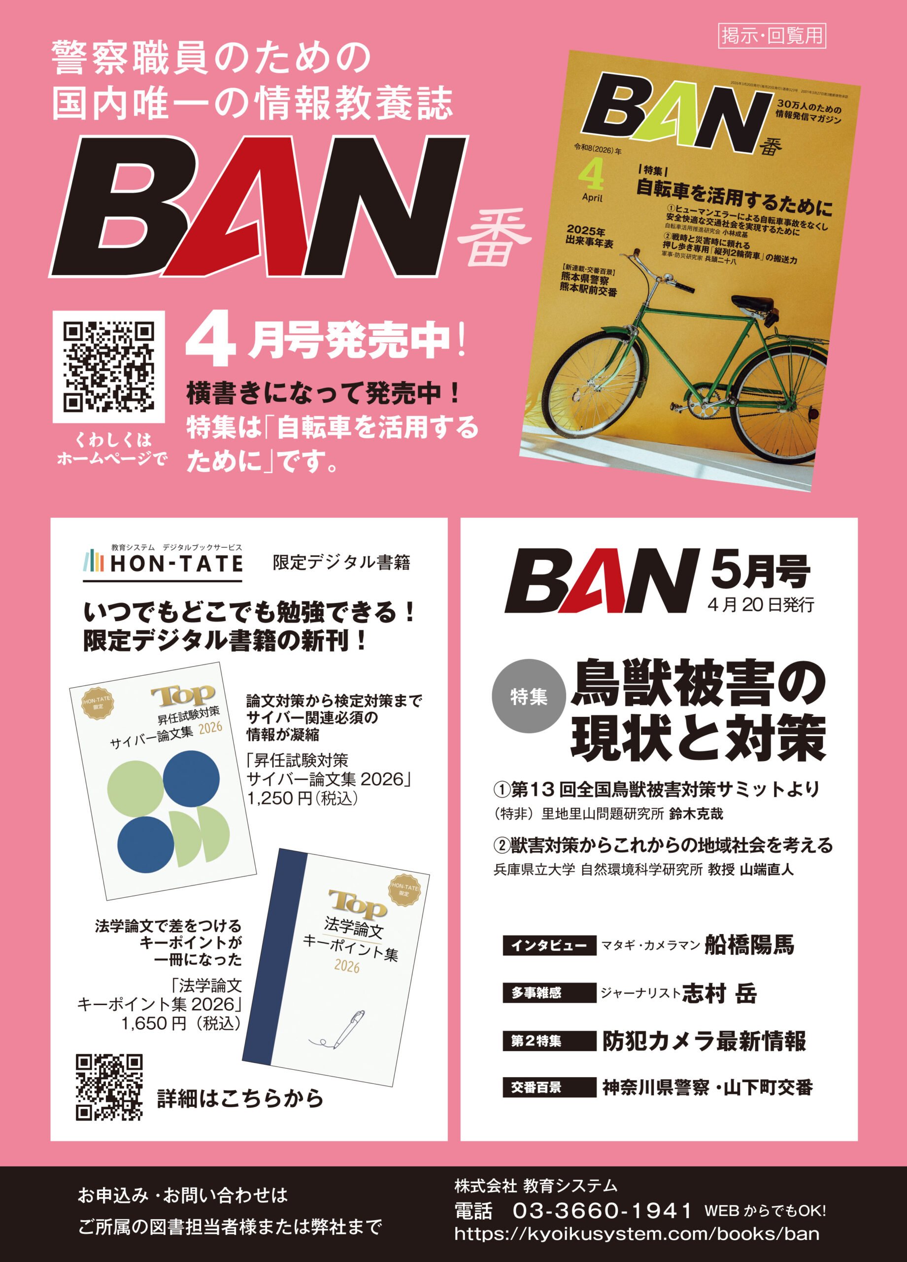 BANは、警察官でなければわからない共感できる情報や声など、警察官のために企画、取材制作している、日本で唯一の警察職員のための『情報教養誌』です。