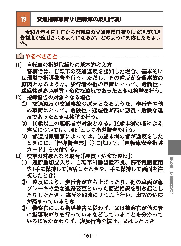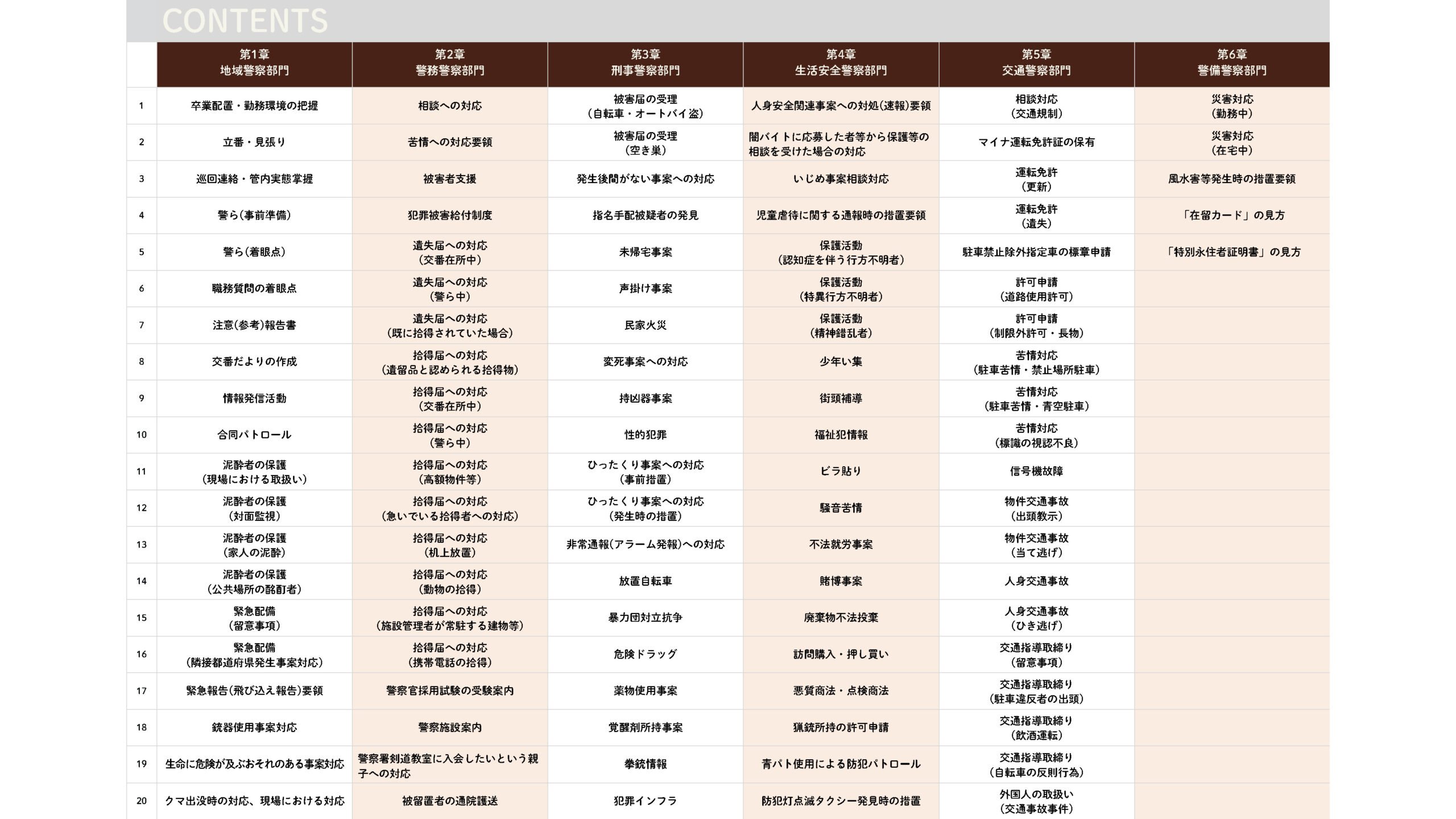 交番で取り扱うものについて、地域警察部門(20事例)、警務警察部門(20事例)、刑事警察部門(20事例)、生活安全警察部門(20事例)、交通警察部門(20事例)、警備警察部門部門(5事例)の計106事例を収録しています。