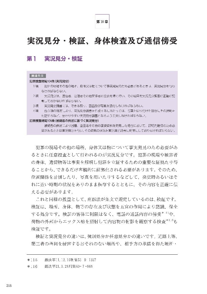 捜査の主体、捜査の端緒、任意捜査、逮捕等の強制捜査、送致、起訴、公判、証拠等、実際の捜査の流れに沿って、より実践的に解説を詳細に掲載。